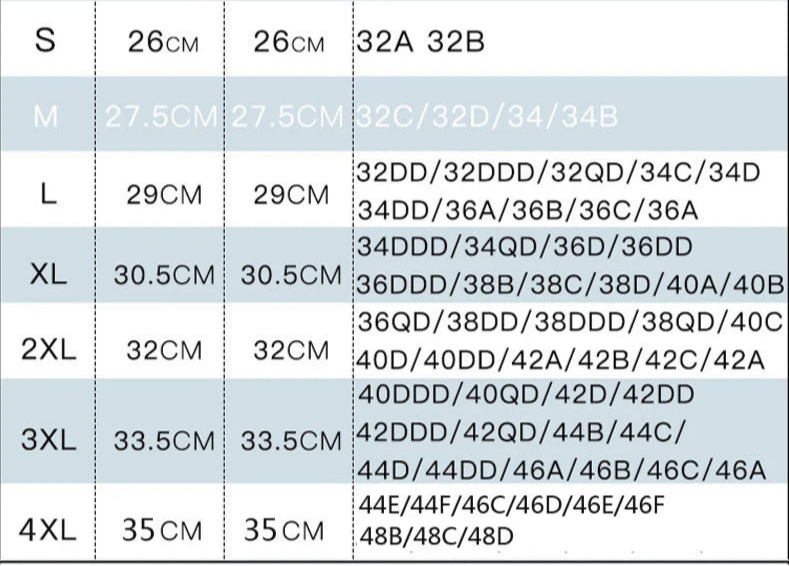 3XL: 36QD / 38DD / 38QD / 40C / 40D / 42A / 42B / 42C / 42A / 40DD / 40QD / 42D / 42DD / 42DDD / 42QD / 44B / 44C / 44D / 46A / 46B / 46C / 46A
